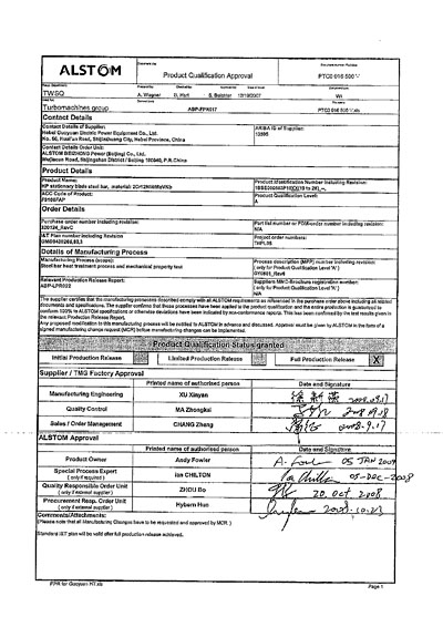 阿爾斯通ALSTOM汽缸螺栓A級(jí)認(rèn)證證書(shū)